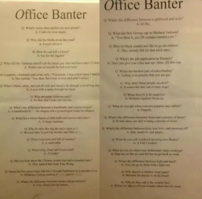 Tha am postair air ainmeachadh Office Banter agus e a’ liostadh diofar abhcaidean a tha gràin-chinnidheach, gnèithealach agus gràineil ri luchd-LGBT.