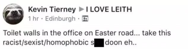 Ann am post air Facebook sgaoil Kevin Tierney dealbh dhen soidhne comhla ris am brath: “Toilet walls in the office on Easter road… take this racist/sexist/homophobic s*** down eh..”.