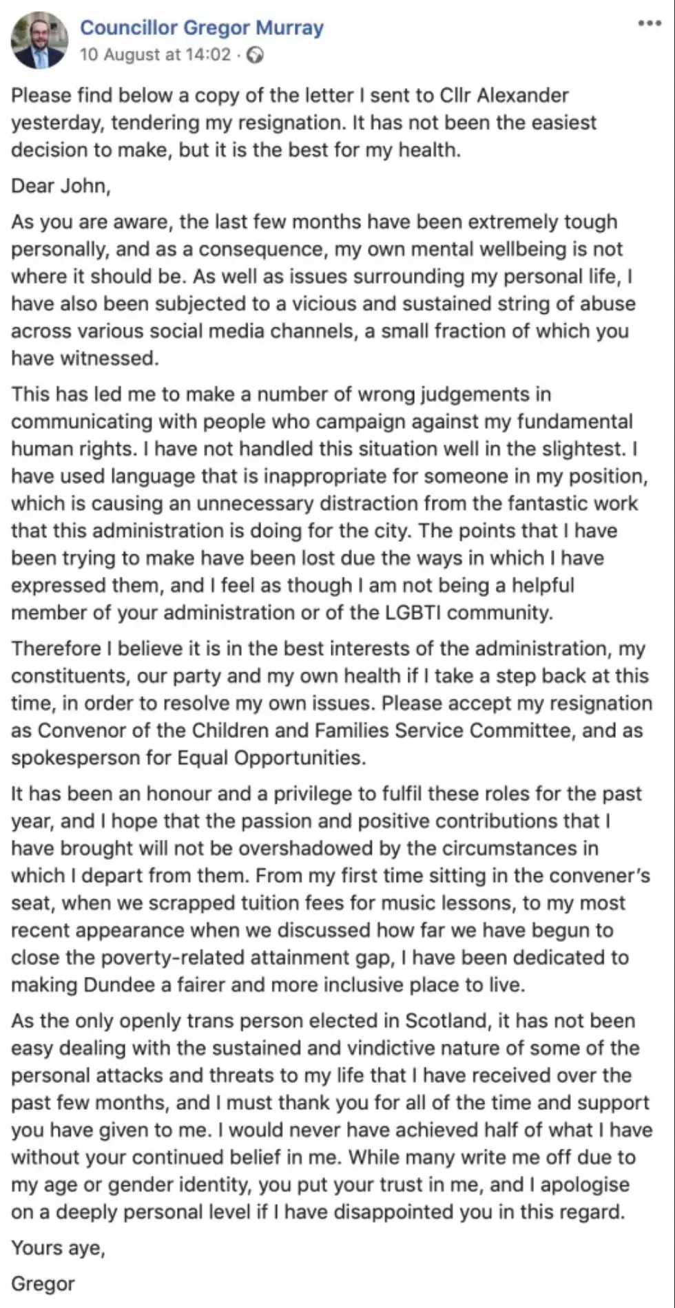 Dh’ainmich Comhairliche Gregor Murray air Facebook gum biodh iad* a’ leigeil às na dreuchdan aca mar Neach-gairm Comataidh Seirbheis Clann agus Teaghlaichean agus mar Neach-labhairt airson Cothroman Co-ionannachd ach gum biodh iad fhathast nan Comhairliche airson Dùn Dè.