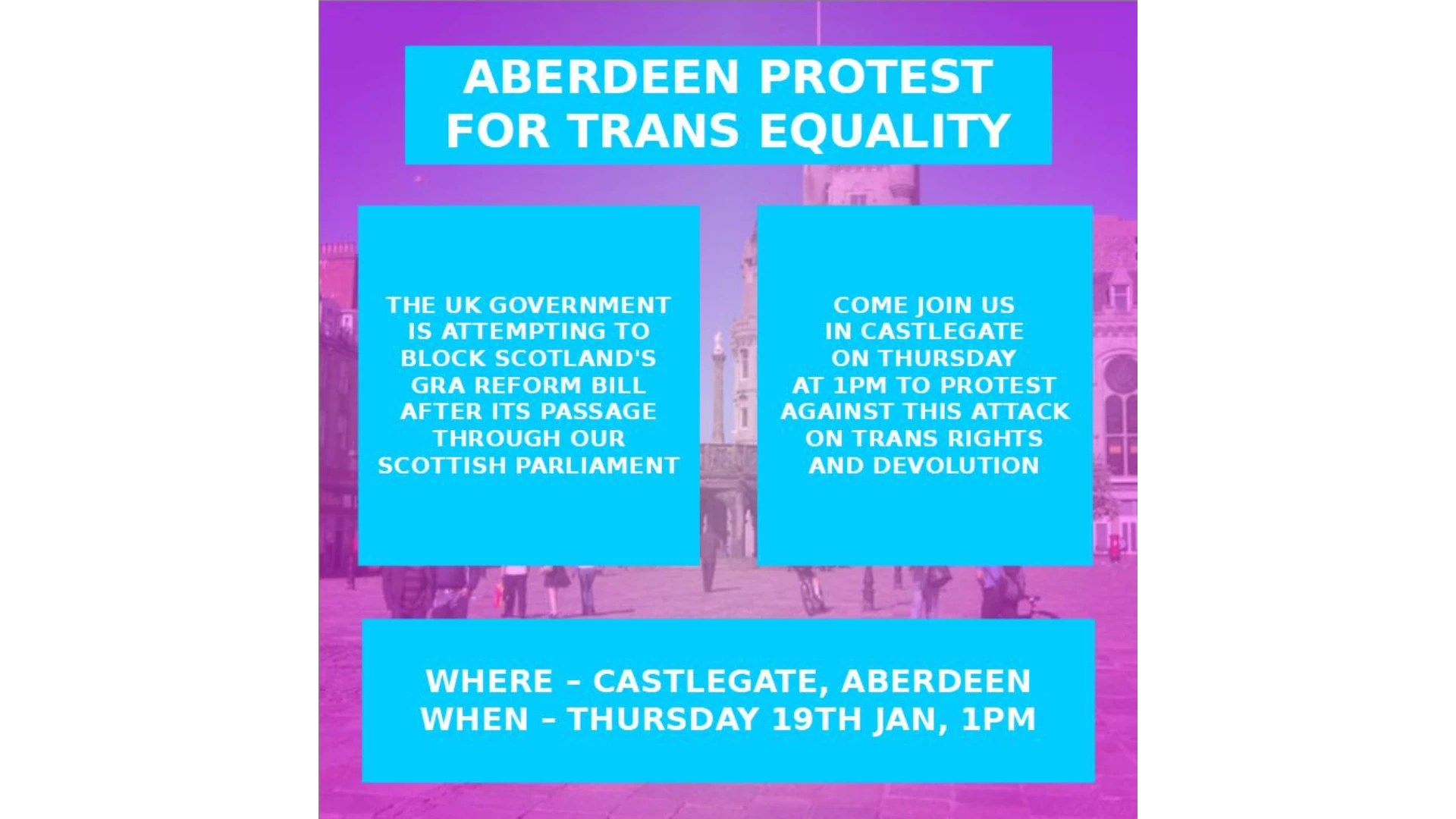 Ma tha sibh gu bhith faisg air Dùn Èideann Diardaoin 19mh den Fhaoilleach, cruinnichidh luchd-iomairt 1.30f taobh a-muigh Queen Elizabeth House gus fianais a thogail an-aghaidh Riaghaltas na Rìoghachd Aonaichte airson bacadh a chur air Bile Ath-leasachadh Aithneachadh Gnè (Alba).