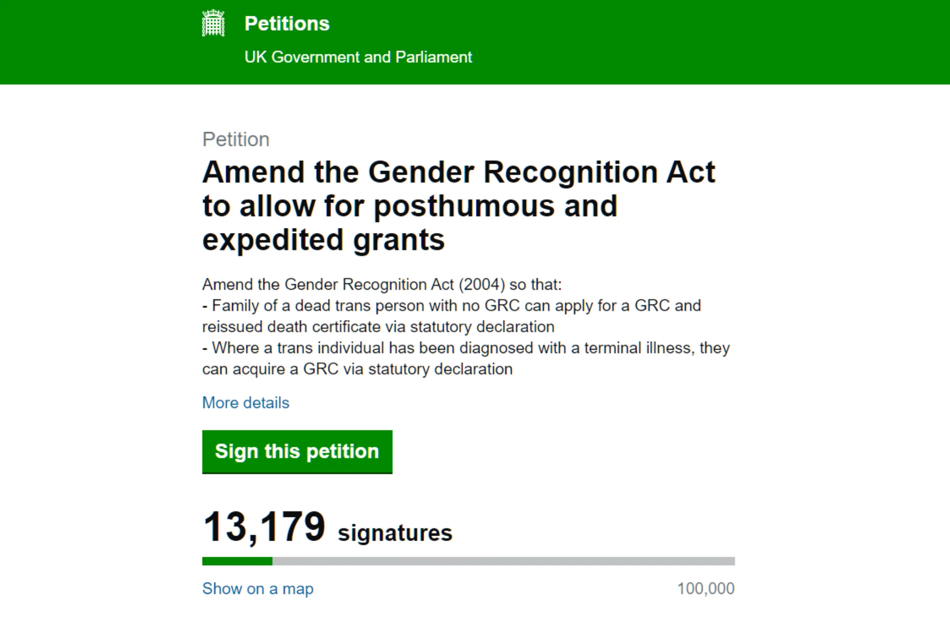 Dhiùlt Riaghaltas na RA athchuinge ag iarraidh orra Achd Aithneachadh Gnè 2004 atharrachadh gus am bi teaghlaichean neach tar-ghnèitheach a bhàsaicheas gun teisteanas aithneachadh gnè comasach air iarrtas a chur a-steach as an leth.