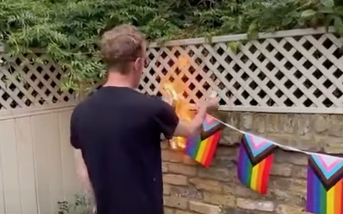 Sgaoil Laurence Fox, Ceannard a’ Phàrtaidh Reclaim agus neach-taisbeanaidh GB News, bhideo air Twitter Didòmhnaich anns an do chur e bratach na pròise ‘na theine fhad ’s a thuirt e “This is what I think of your vile, disgusting, child sacrificial flag”.