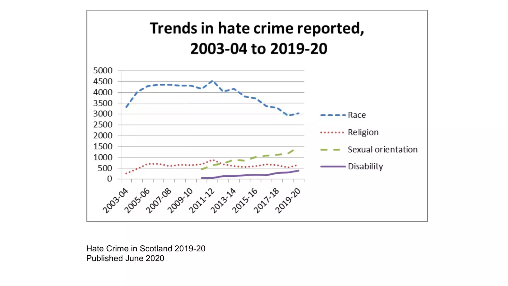 Tha figearan oifigeil bho Oifis a’ Chrùin a’ sealltainn gu bheil an àireamh de dh’eucoirean gràin air an adhbharachadh le gràin co-sheòrsachd ann an Alba...